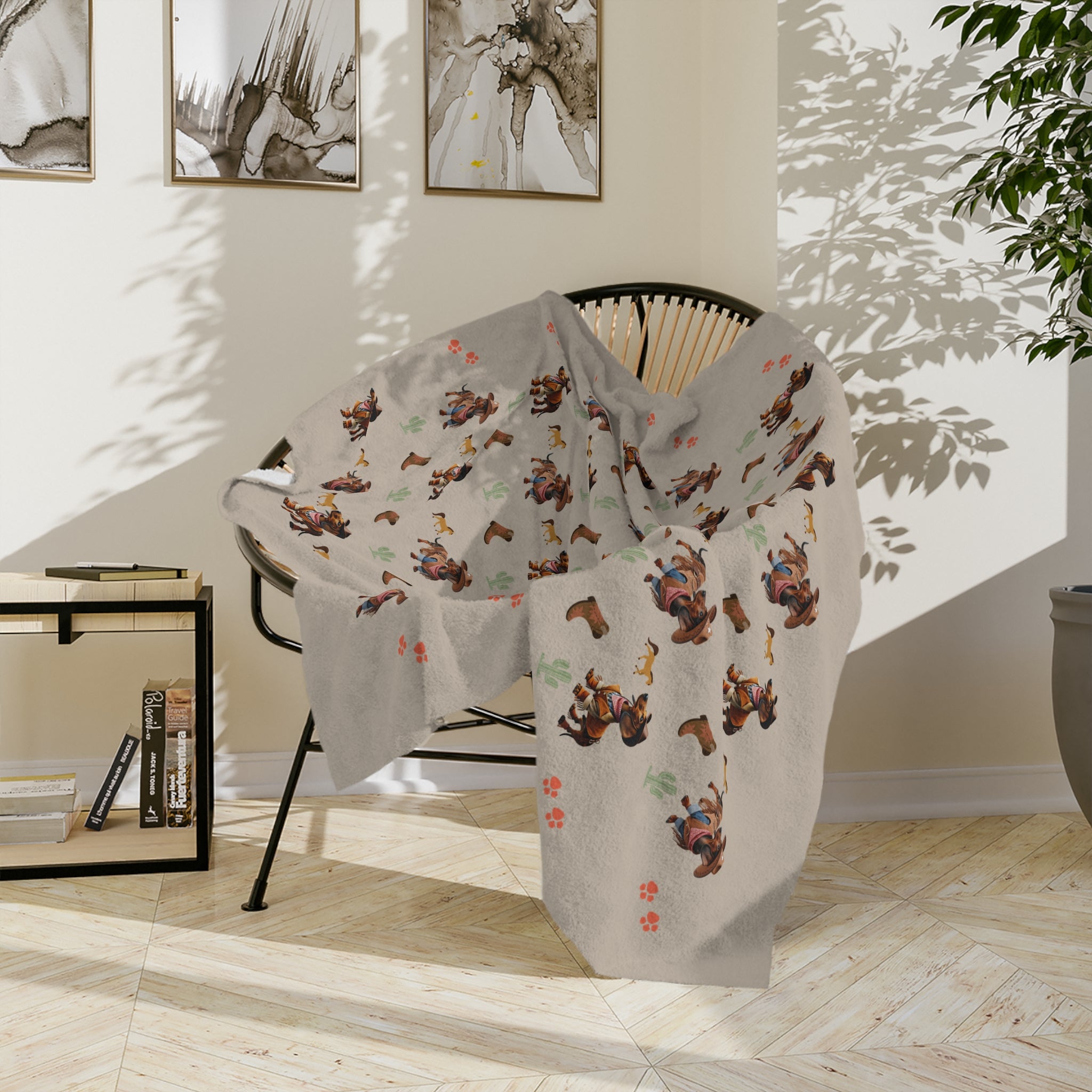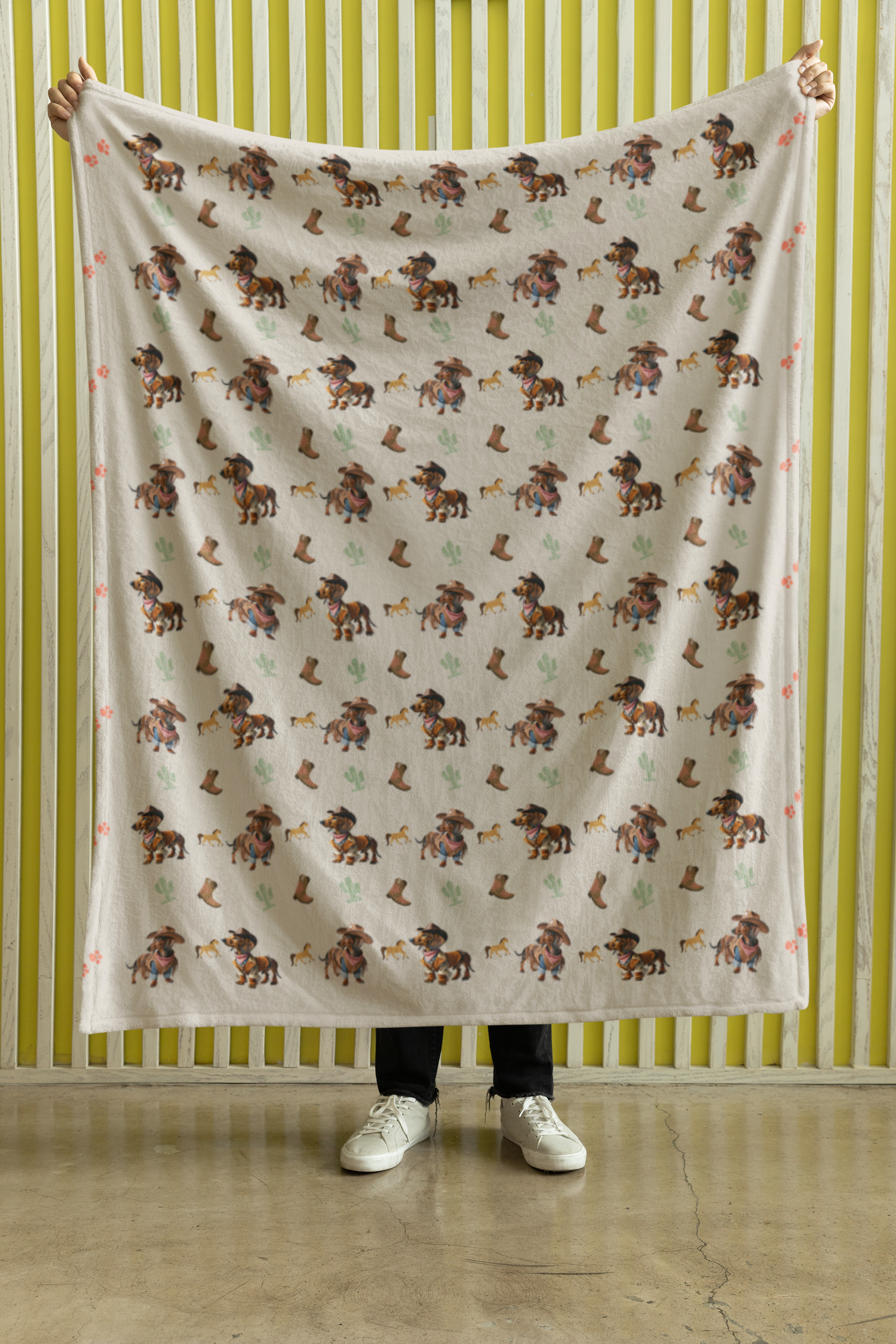Giddy up, dachshund lovers! The Western Wiener sherpa throw blanket brings a rootin’ tootin’ twist to cozy nights with an irresistibly soft feel and a wild western design. Featuring adorable dachshunds dressed in full cowboy attire—complete with hats, boots, and bandanas—this blanket is perfect for those who love their wiener dogs with a side of country charm.