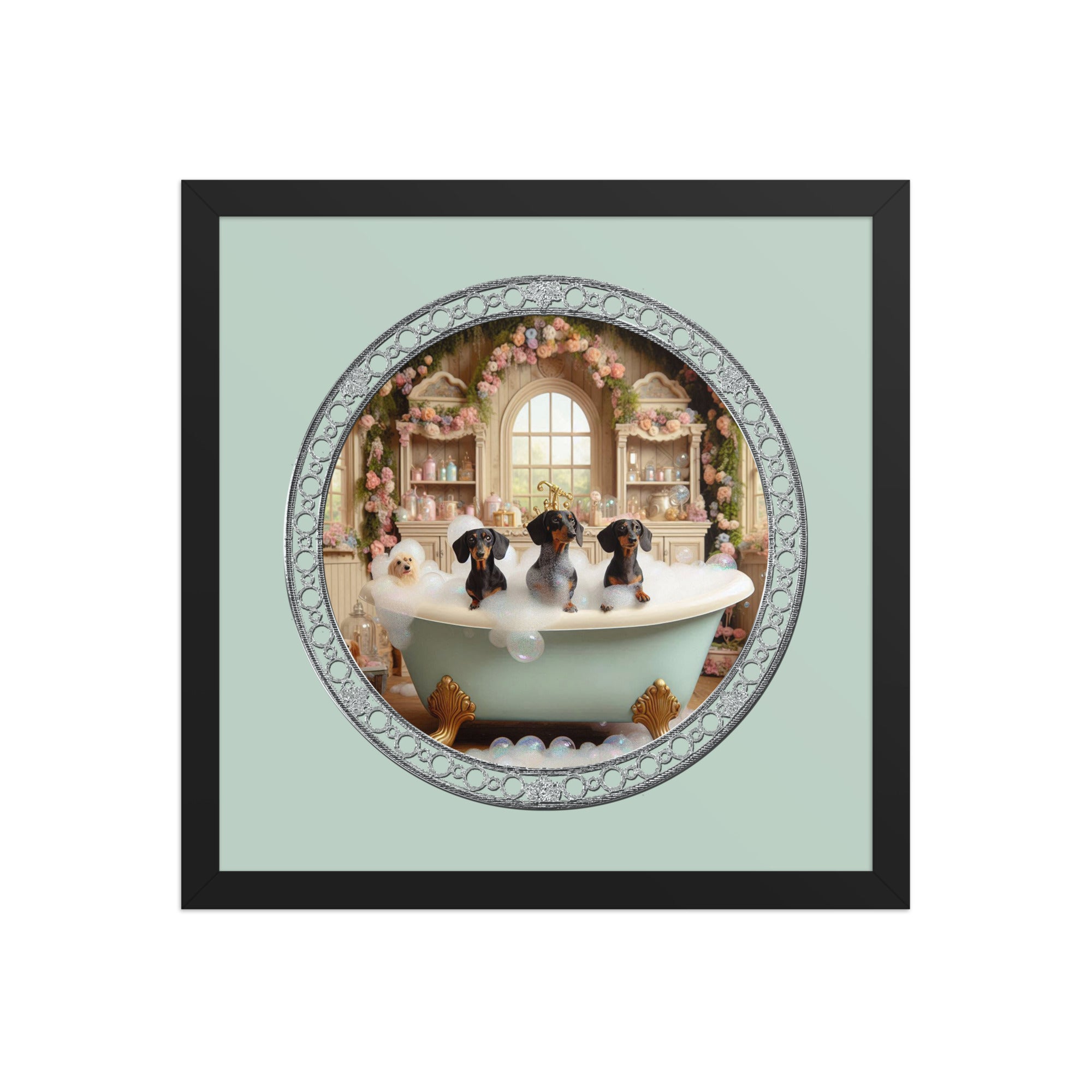 The artwork showcases whimsical dachshunds in a Victorian bath complete with bubbles making it the perfect addition to bathrooms, powder rooms, or gallery walls. Ideal as a gift for dachshund lovers, dog enthusiasts, or anyone who appreciates a fusion of humor and vintage design, this framed picture brings joy, personality, and classic style to any home. Timeless charm meets dachshund delight—give your walls the perfect blend of whimsy and elegance!