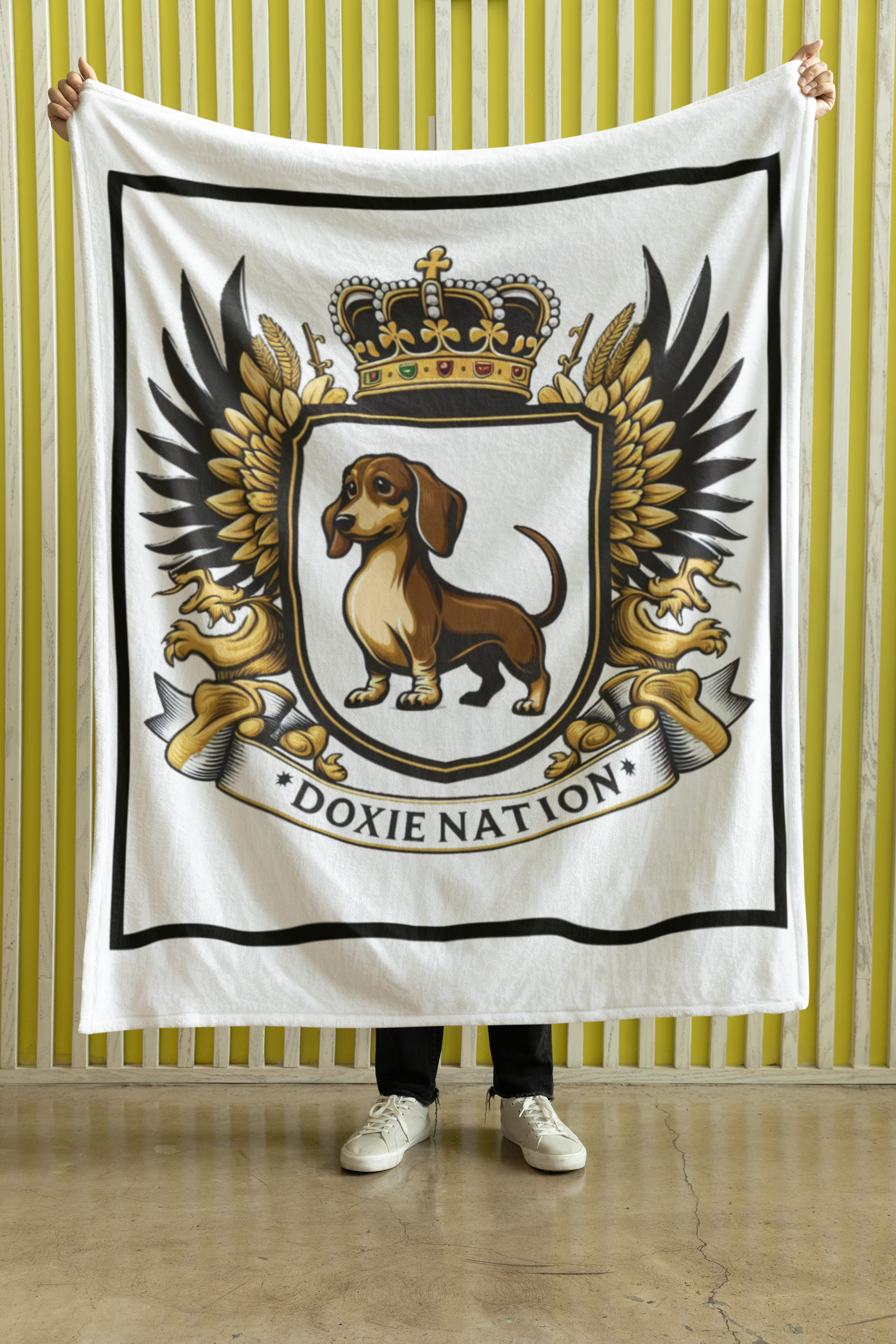 Wrap yourself in dachshund pride with our lightweight throw blanket featuring a stunning framed Doxie Nation coat of arms with a noble dachshund at its heart. This elegant design blends classic heraldry with beloved dachshund charm, making it the perfect accent piece for your home.