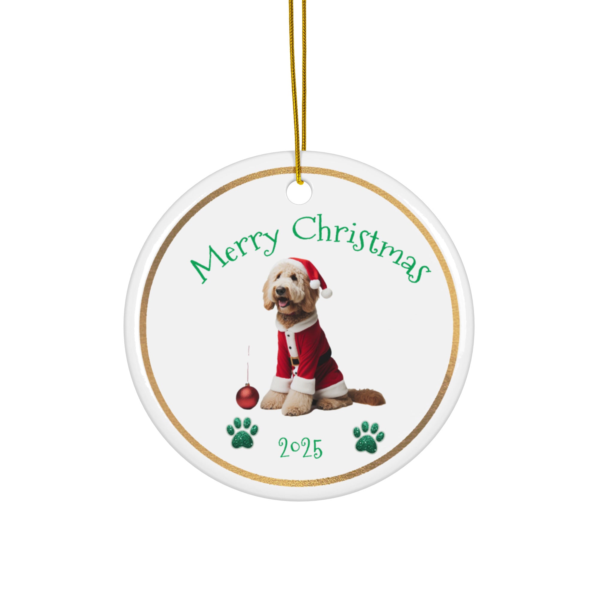 Celebrate the season with this charming round ceramic Christmas ornament featuring a lovable Labradoodle in a Santa suit! Perfect for dog lovers, this high-quality ornament is crafted from durable, 100% ceramic. The festive boxer design brings a playful and heartwarming touch to your Christmas tree. Whether as a gift or a special addition to your holiday collection, this ornament is sure to spread joy and festive cheer for years to come!