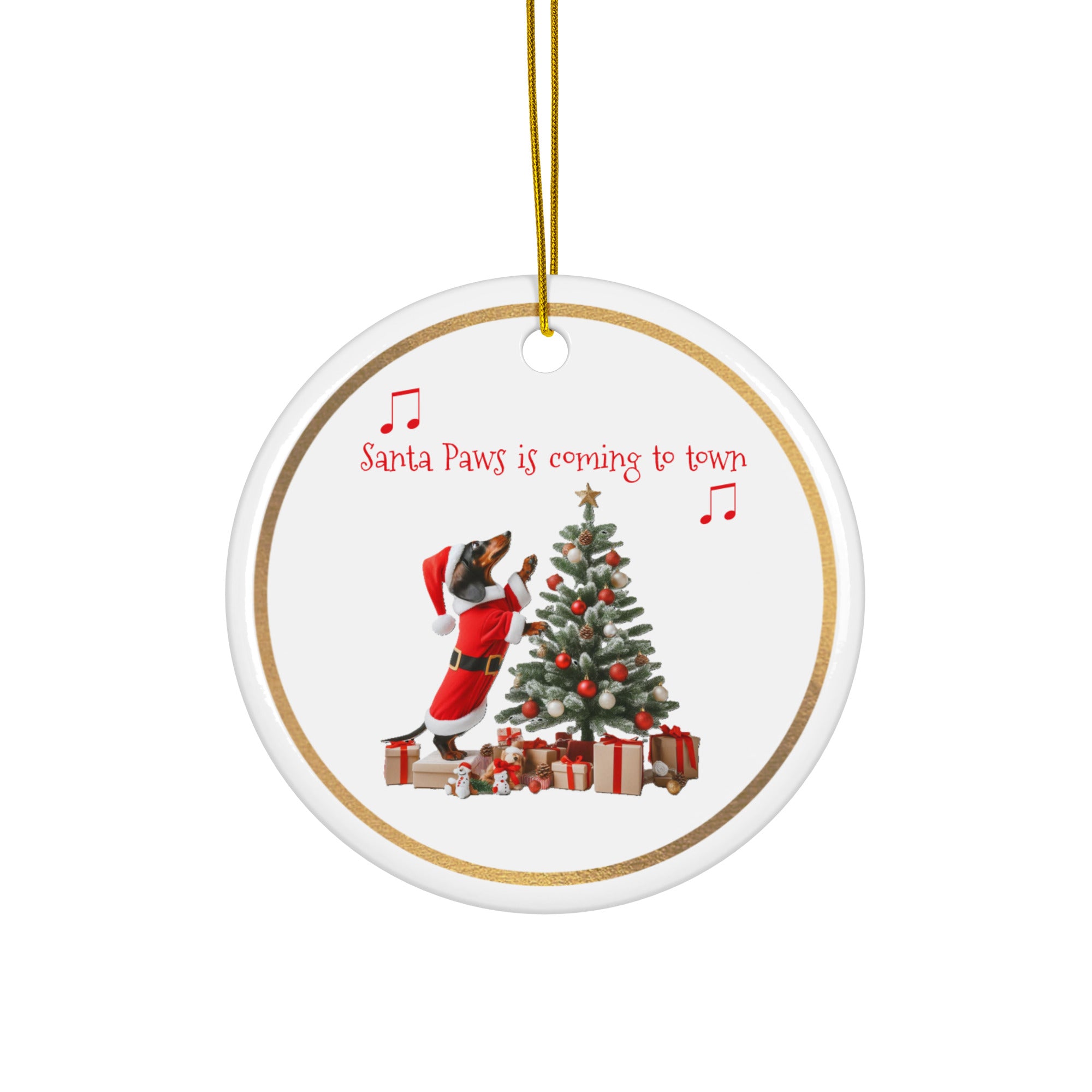 Celebrate the holidays with this adorable round ceramic ornament featuring a dachshund in a Santa suit decorating a Christmas tree! Crafted from durable 100% ceramic this ornament combines festive charm with a sleek design that complements any holiday decor. Perfect for dachshund lovers, it captures the playful spirit of the season and makes a thoughtful gift or a delightful addition to your tree. Bring smiles and holiday magic to your home with this whimsical keepsake!